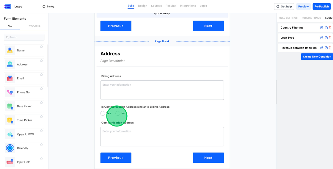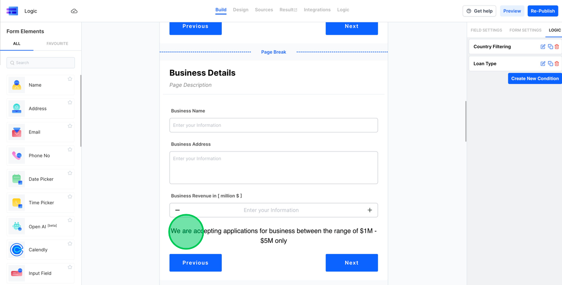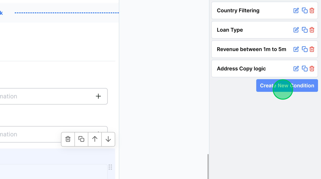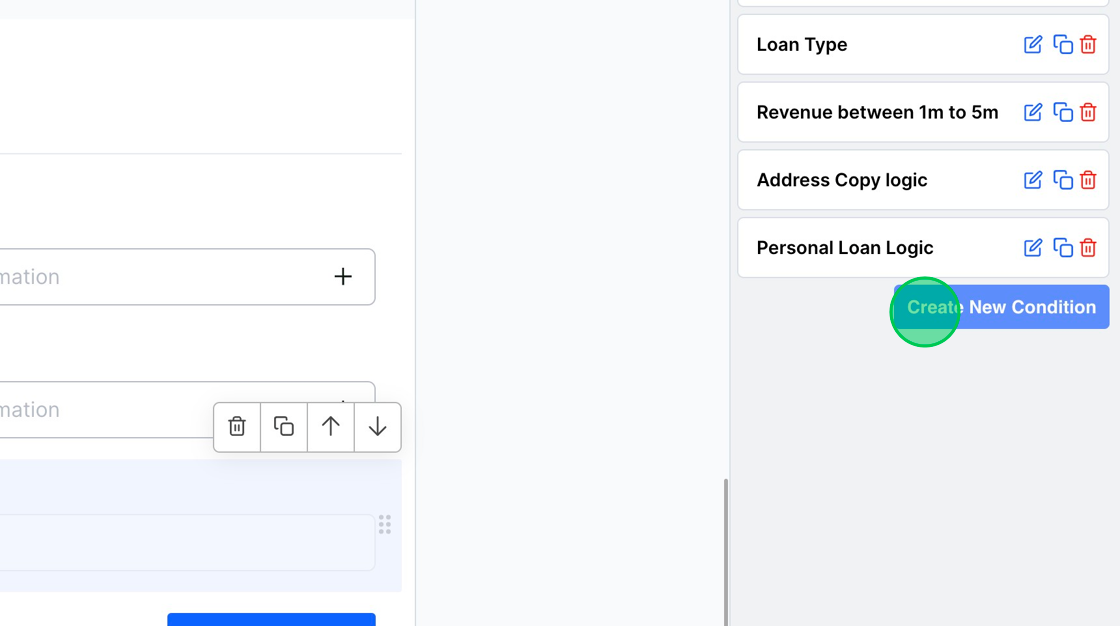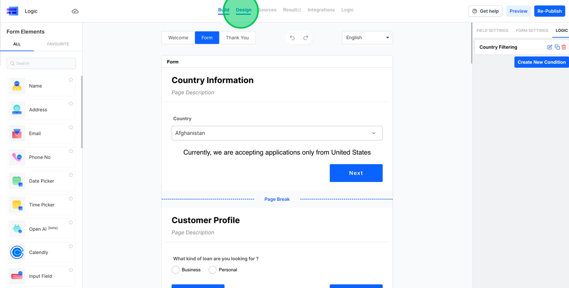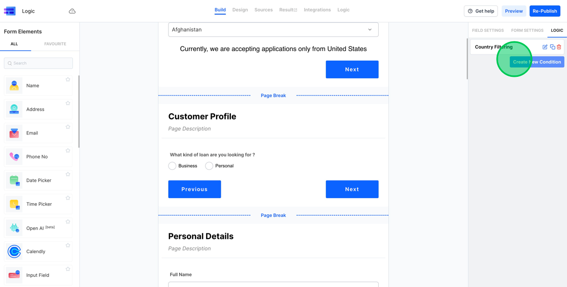 12. Next, we’ll work on setting up a condition that hides specific steps based on the type of loan the user is applying for. Remember, there’s no cap on the number of conditions you can configure. Navigate to “Logic” and you’ll observe the “Country Filtering” condition we previously established. To create a new condition, simply click on the “Create New Condition” button.