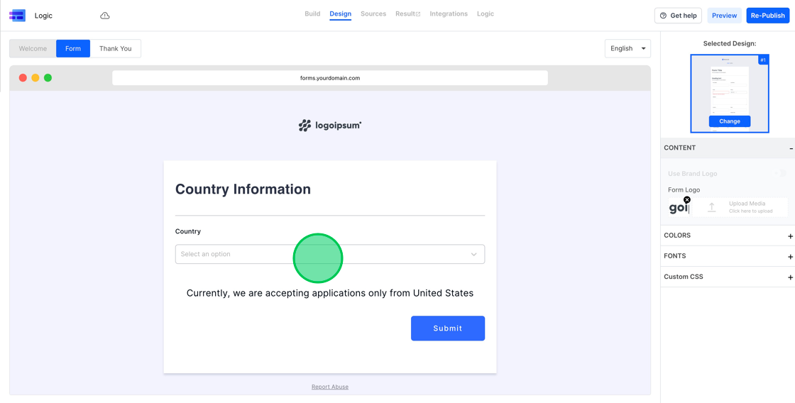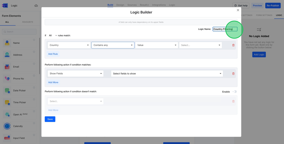 2. Upon navigating to the logic section, you’ll notice an empty screen since no logical conditions have been set yet. To begin, click on the “Add Logic” button. For our initial logic setup, we’ll configure it to permit only users from the United States to access the assessment form.
