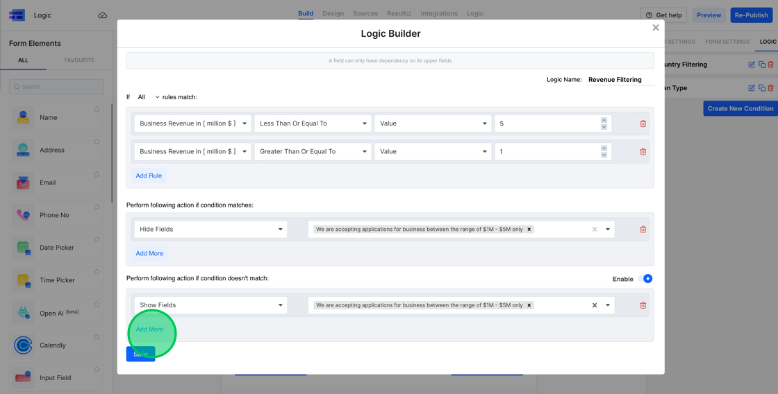 20. Begin by selecting the “Business Revenue in [million $]” field. To ensure the revenue stays within the range of $1M – $5M, we’ll configure two conditions: