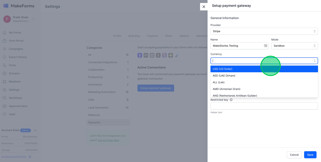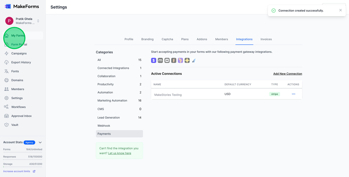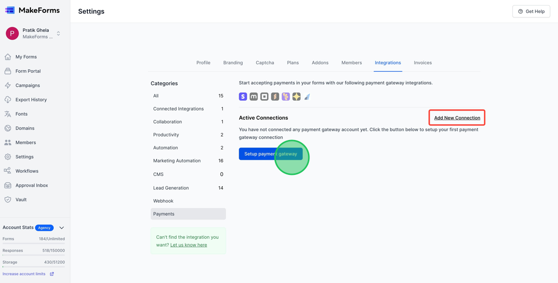 1. MakeForms allows you to receive payments. To start, you must establish your Payment Gateway Connection. This connection is configured at the WorkSpace level.