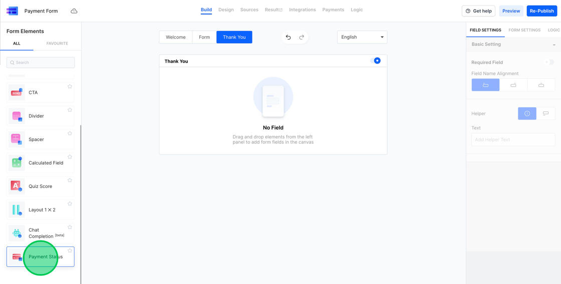 9. Within the form elements, select the “Payment Status” element.