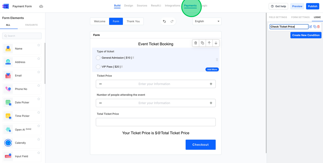 2. Having established a form that adeptly calculates the total checkout amount, our next step is to configure this value for the checkout session. Achieve this by clicking the “Payments” tab.