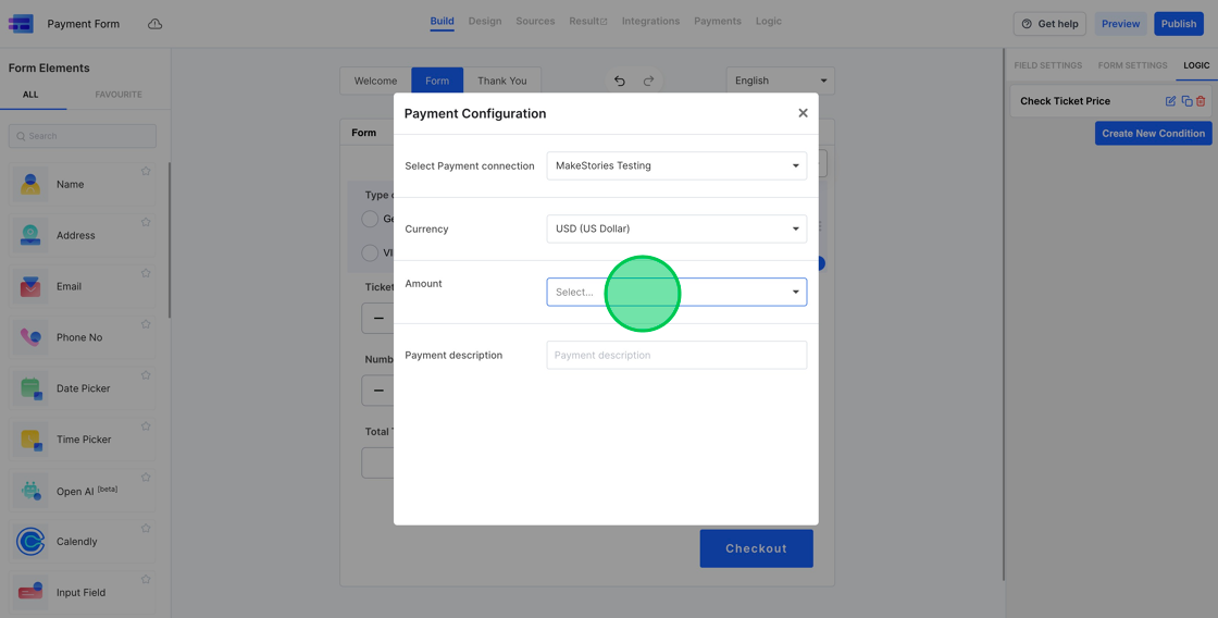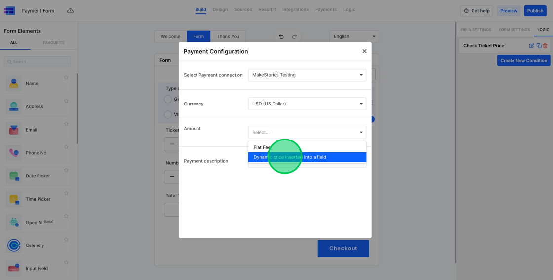 5. Having configured the Payment Connection and currency, our subsequent action involves determining the checkout amount. MakeForms offers the flexibility to either opt for a fixed fee or to dynamically determine the checkout sum based on a form field’s value. Given that we’ve already arranged the logic for ticket price computation, our choice will be the latter option, labeled as “Dynamic price inserted into a field.”