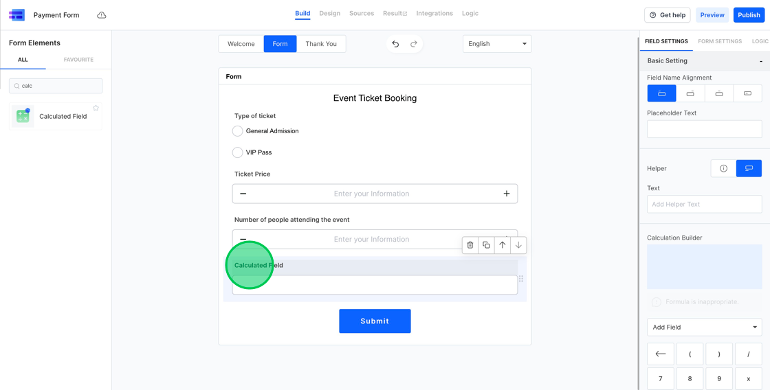 4. Within the settings for the calculated field, use the “Calculation Builder” to determine the final checkout amount by multiplying the ticket price by the number of tickets selected.