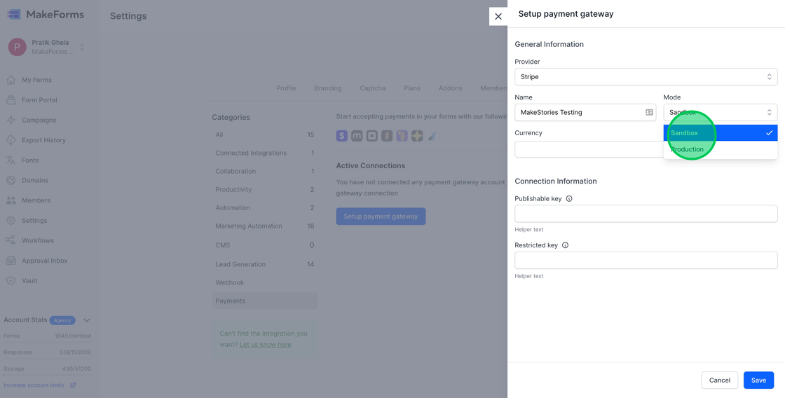 3. Upon clicking, a configuration window for payment settings will appear. First and foremost, choose the Connection. This refers to the payment connection we established at the start of this guide. For our purposes, opt for “MakeStories Testing.”