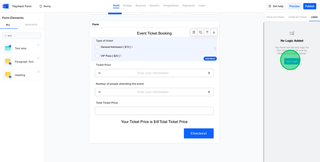 1. With the calculations in place, our subsequent task is to adjust the ticket price according to the chosen ticket type. For this purpose, we’ll utilize the “Logic” functionality in MakeForms. Access this feature by selecting the “Logic” Tab on the right sidebar. If no logic has been previously configured, you’ll spot a blue “Add Logic” button within.