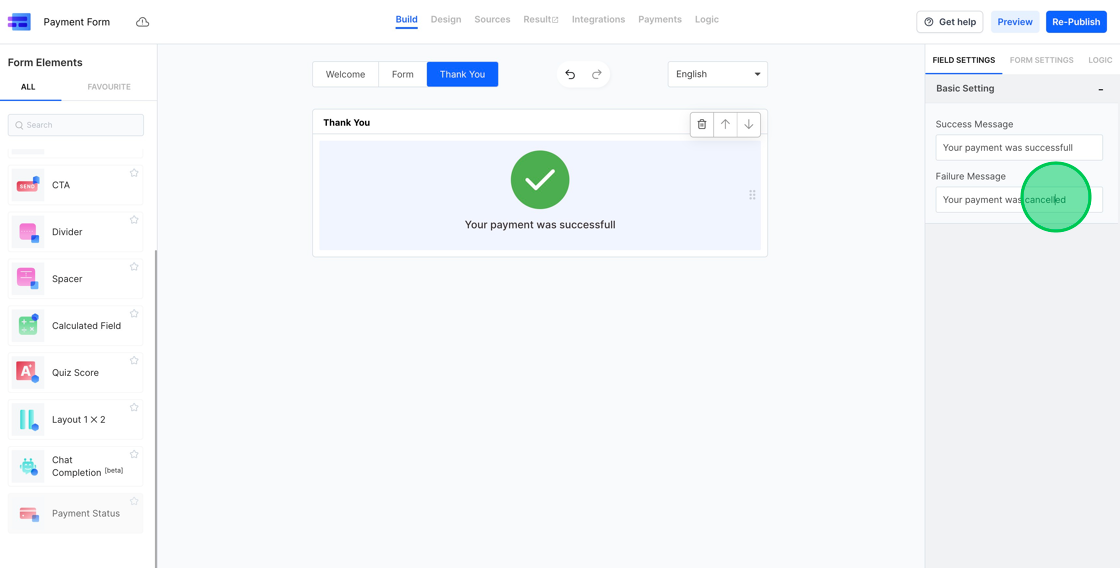 10. On the right sidebar, you have the option to modify the Payment Success and Failure Messages.