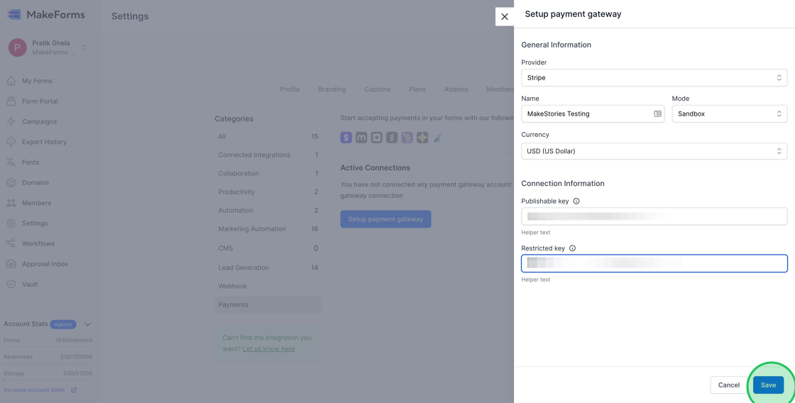 8. Next, input the Publishable key and Restricted Key for your Stripe Account. To understand how to retrieve these keys, please refer to the documentation at https://stripe.com/docs/keys. Once all the details are filled in, click the “Save” button.